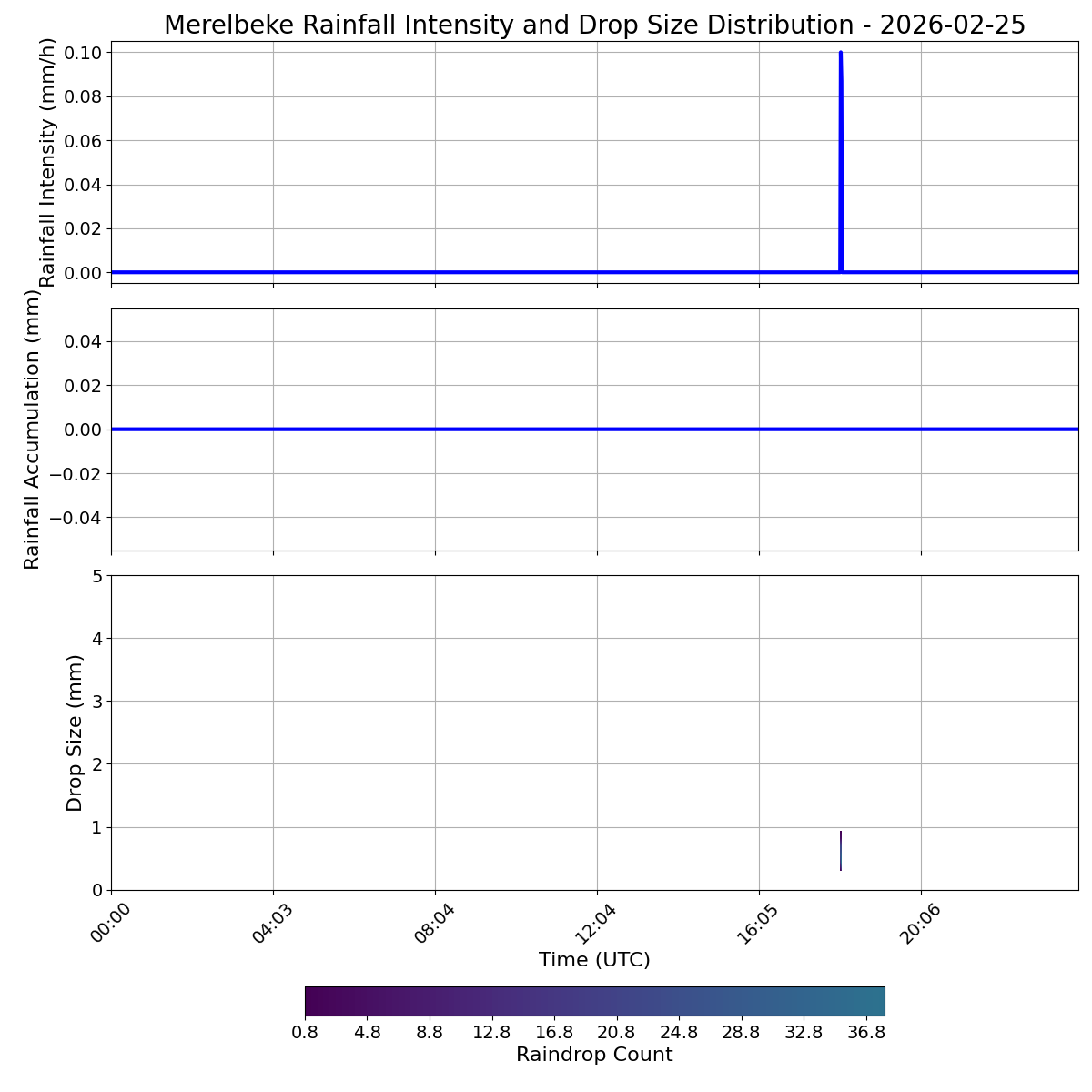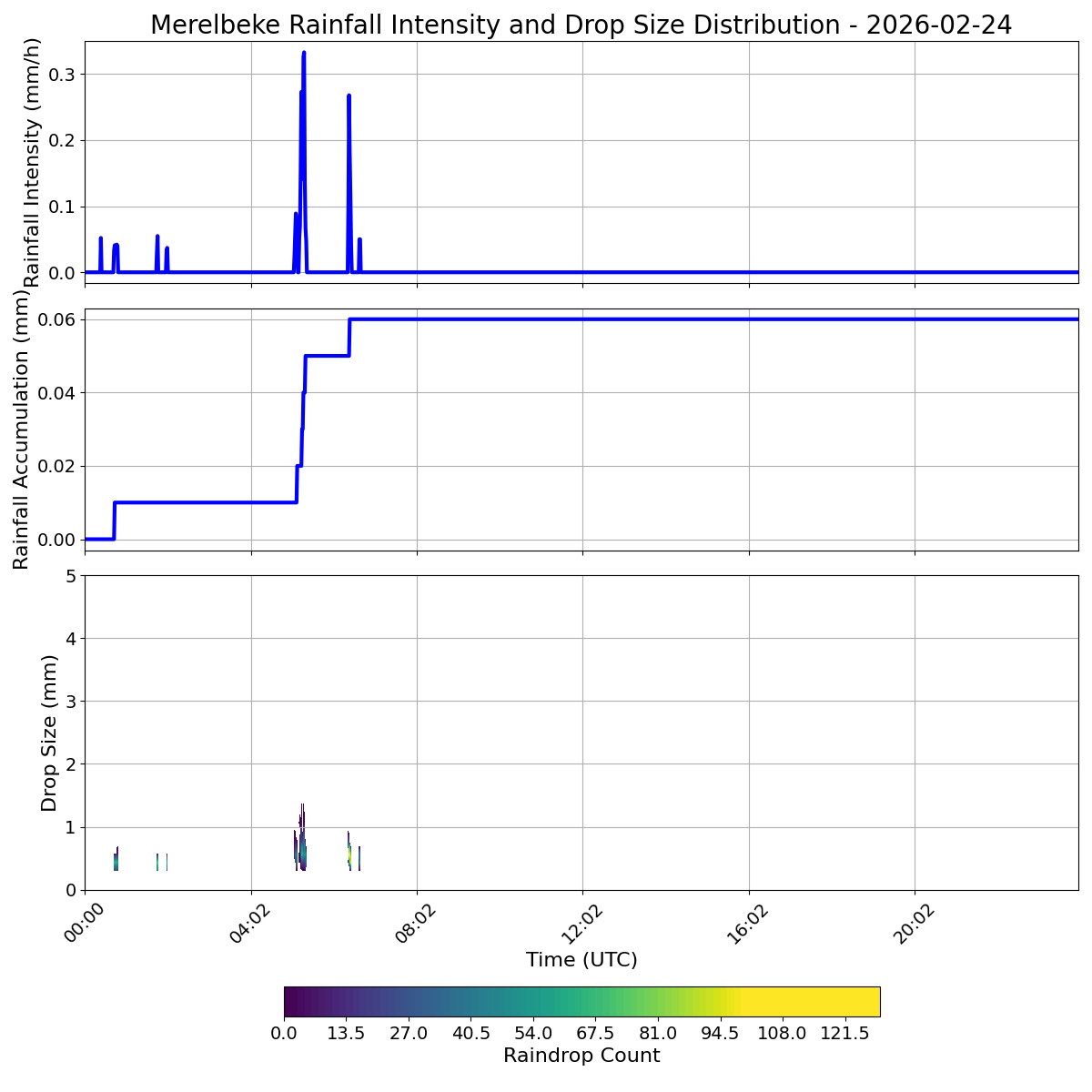 The "Climate & Earth" team's disdrometer setup and processing backend produces daily updated graphs of precipitation measurements from the disdrometer and rain gauge at ILVO, Merelbeke.